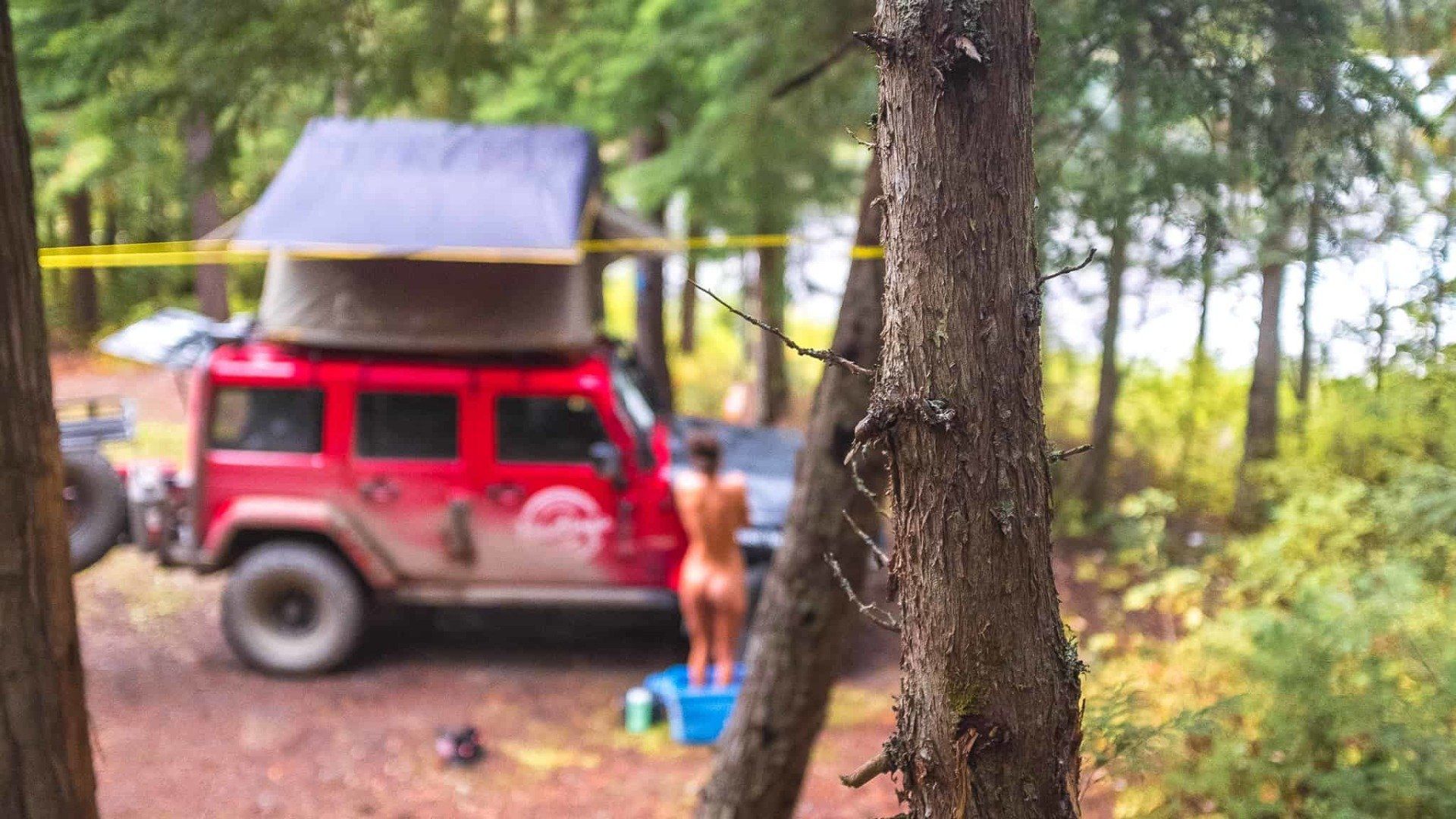 Malgré la pluie et le ciel chargé, les couleurs automnales rendent l’endroit lumineux et puis, nous sommes parfaitement équipés : Jeep, tente, feu de camp, bâche, paddle, K-way…